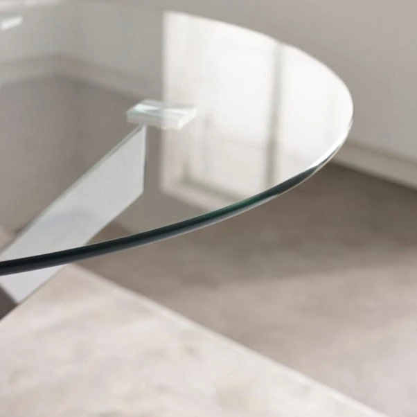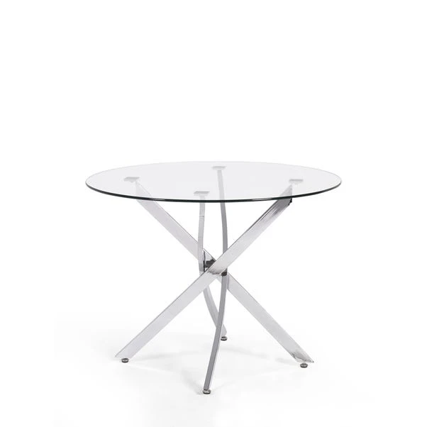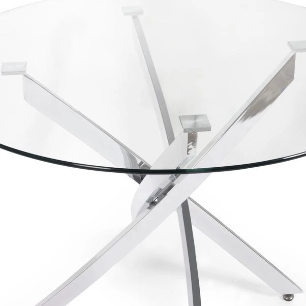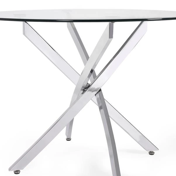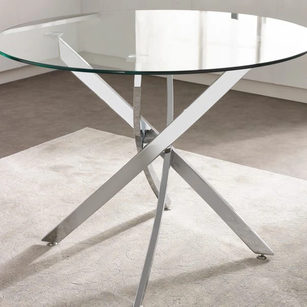 Sleek and contemporary, the Anderson glass dining table offers a clean, minimal aesthetic that complements any modern home. The clear tempered glass top gives an open, airy feel, while the polished chrome crossover base adds bold contrast and stability. Ideal for compact or open-plan spaces, it makes a stylish yet functional centrepiece for casual meals or elegant dinner parties.