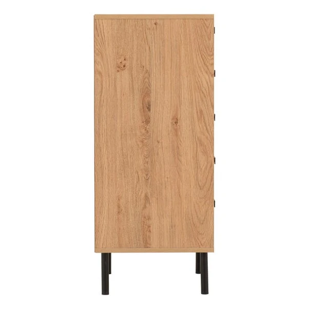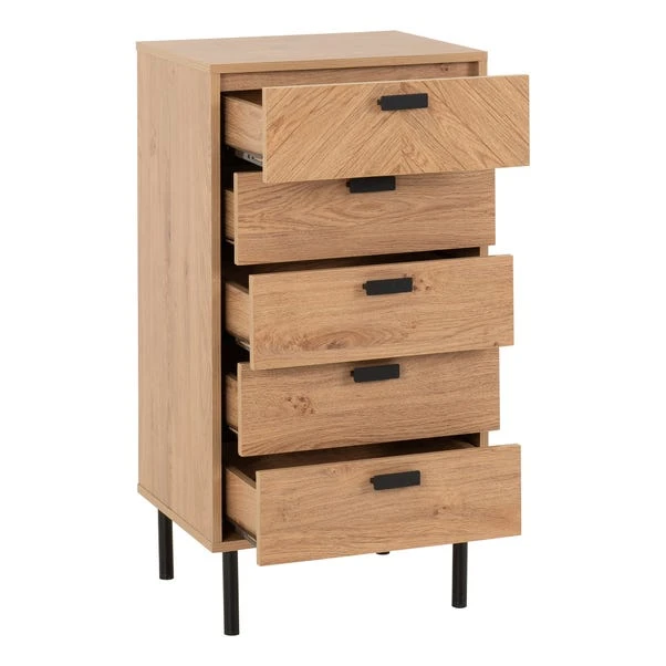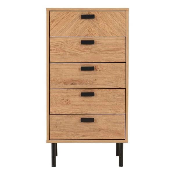 This stylish piece is crafted in a medium oak effect, showcasing a charming wood grain finish that exudes natural elegance and sophistication. Perfectly suited for bedrooms, living rooms, or offices, this narrow chest offers ample storage while enhancing the room’s aesthetic. Its five spacious drawers, adorned with durable black metal hardware, provide an ideal solution for organising clothes, accessories, or household items, ensuring everything has its place.