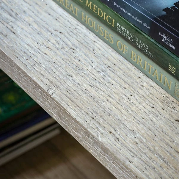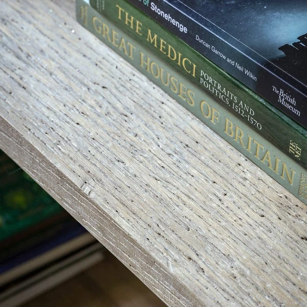 Ideal for an apartment living look, this stylish display unit features an open design with wooden veneer shelves combined with a metal frame. The wood has a very light wash to highlight the grain of the timber and contrasts beautifully with the dark pewter finish of the metal. A matching display table is also available.