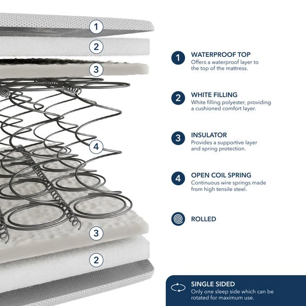 Crafted with a Open Coil Bonnell Spring Unit for superior comfort and easy rotation, this mattress goes the extra mile with a waterproof panel fabric. The fabric allows for easy surface cleaning, preventing stains and maintaining a fresh sleep environment. With a single-sided design and rolled for accessibility, this mattress seamlessly combines practicality with comfort.
