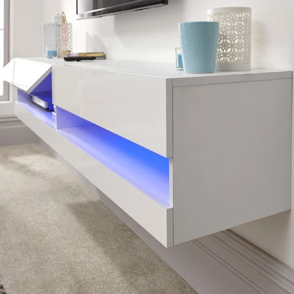 Crafted with a contemporary, minimalist design, the Galicia 180cm wall tv unit would be a great addition to any modern living room and is available in a choice of black, grey or white colourways. This self-assembly stand features two spacious open shelves, with two lift-up doors to allow easy access whilst keeping the design low-profile when closed. The TV unit also comes with a hidden AV access point allows cables to be hidden out of sight and battery-operated LED lights, perfect for illuminating your consoles and devices beneath or to provide mood lighting.