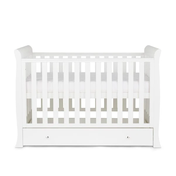 Perfect for a more compact nursery space, this cot bed has smaller design. This cot bed will be suitable for your little one as they grow to be around 4 years old. As they grow, you can alter the mattress height to help cater for their safety. Included with the bed are toddler rails for then they begin learning to sleep in a bed. When your child is old enough, the sides can be removed to convert the cot into a toddler bed or a daybed. It also comes with a built-in under drawer which gives you that extra little bit f storage space. The bed will look great alongside the rest of the Ickle Bubba Snowdon range.