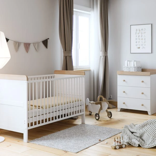 The Classic Oak Effect Cot Bed and 3 Drawer Chest Nursery Set from Little Acorns showcase a clean and contemporary look. Suitable for use from birth to approximately 4 years, the cot bed is adjustable to three mattress heights, converts into a toddler bed, and features teething rails. The accompanying dresser and changing unit offer three spacious drawers and a removable changing surround for enduring functionality.