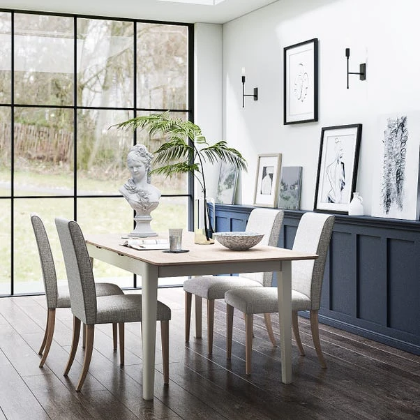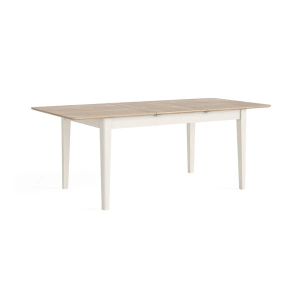 This table features an oak effect top that beautifully showcases the natural wood grain, adding warmth and elegance to any space. The contrasting legs provide a modern touch, creating a striking visual appeal that complements a variety of decor styles. Designed for both functionality and aesthetics, this dining table smoothly extends, allowing you to comfortably accommodate 4 to 6 guests.