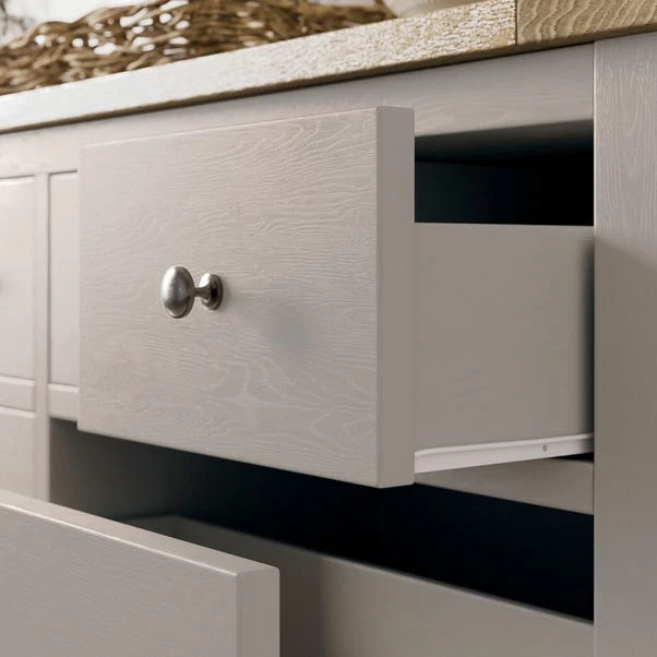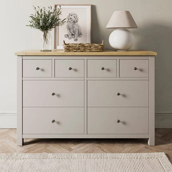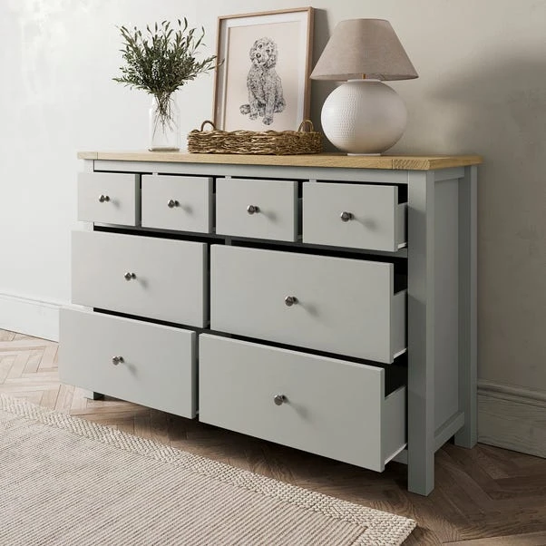 This exquisite chest of drawers is a testament to fine craftsmanship and thoughtful design, enhancing the aesthetics of any bedroom. Boasting a wide profile, it offers ample storage space across its eight drawers, providing a solution for keeping your space tidy and organised. The painted finish adds warmth to your decor, creating a welcoming atmosphere. Each drawer is thoughtfully designed with easy-glide functionality, making access to your belongings effortless. The spacious top surface allows for additional decor elements or serves as a functional space for your daily essentials.
