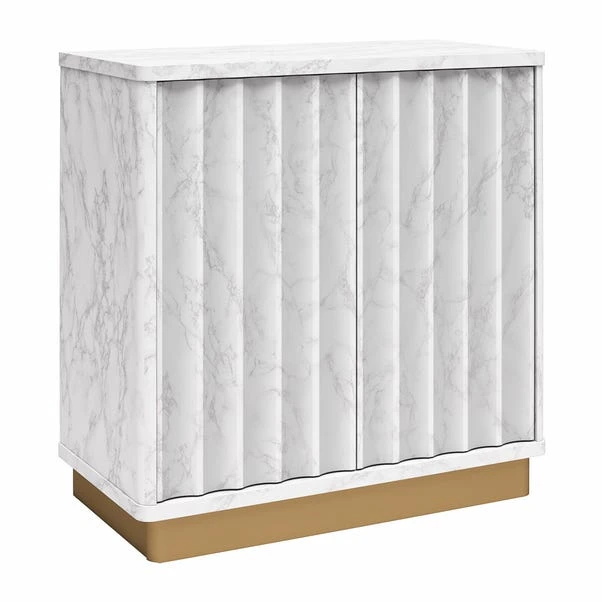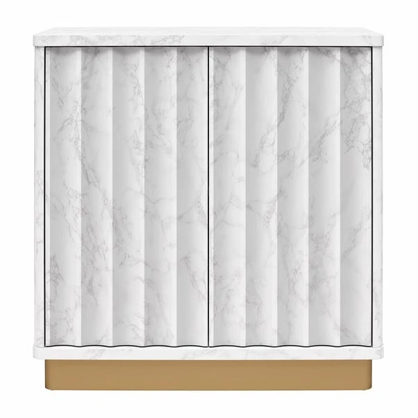 With its faux marble surface and elegant bronze accents, this accent table adds sophistication to any room. Featuring push-latch doors and adjustable shelving, it offers convenient storage while adding visual intrigue to your space. The unique scalloped details and bold silhouette make this sideboard a standout piece in your home, blending timeless elements with modern flair.