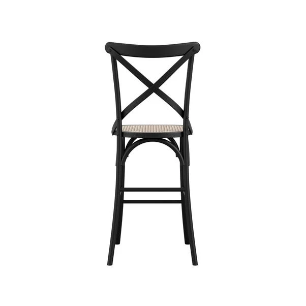 Fitzroy Cane Bar Stool The Fitzroy Cane Bar Stool exudes French bistro style with its cross back detail and solid black frame. The natural cane seat pad and curved backrest ensure both elegance and comfort.