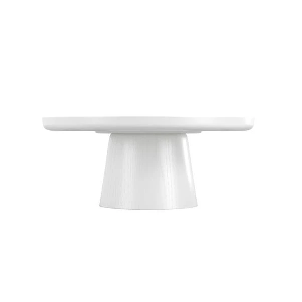 The Rumi Coffee Table features a contemporary design with a white wood grain-effect and conical shaping. Its curved edging adds a touch of elegance, making it suitable for multi-room use. This versatile piece blends seamlessly into any modern living space.