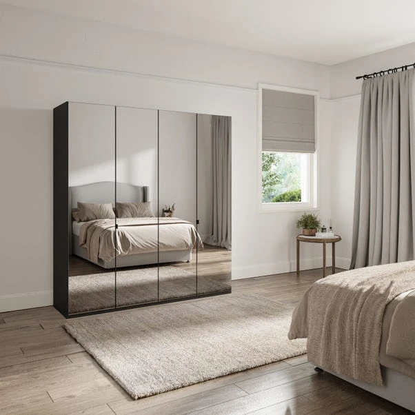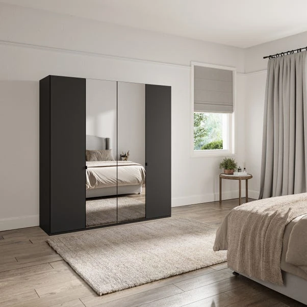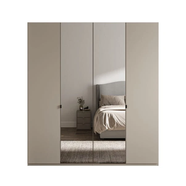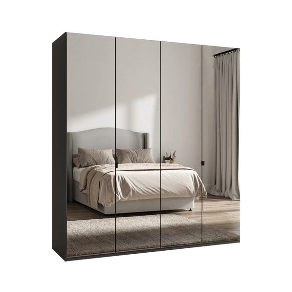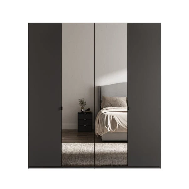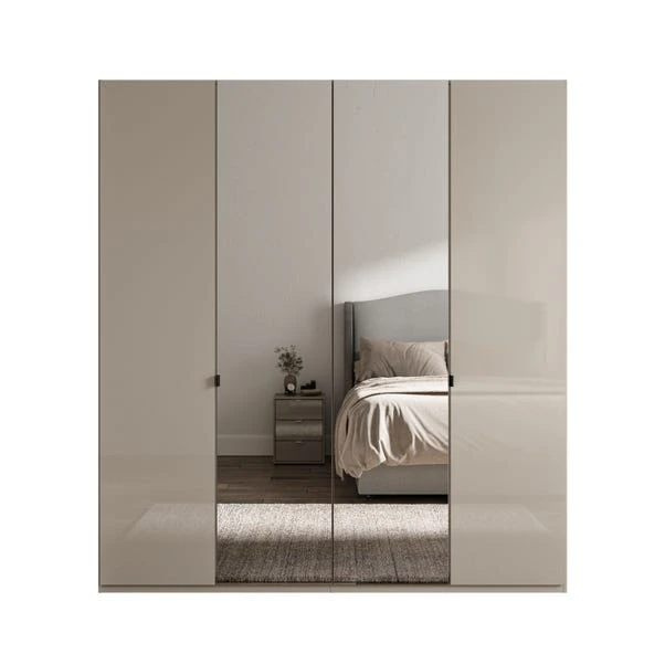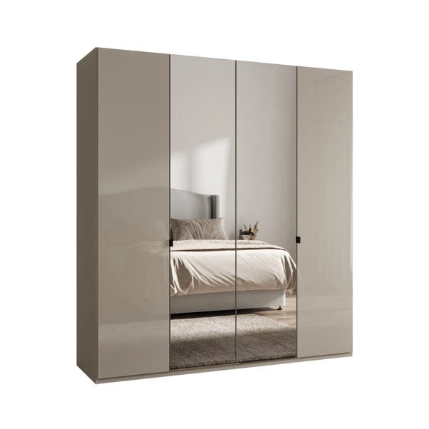 Step up your style and organization with the Kahla 4 Door Wardrobe, offering a clean, modern design perfect to complement a range of interior styles. Its damped hinged doors open smoothly, revealing a generous storage space complete with adjustable shelves and hanging rails, allowing you to customise it to suit your needs. The modern slate coloured handles add a touch of sophistication, perfectly complementing the wardrobe’s contemporary design. Choose between glass and matt finished fronts in a choice of stylish colours, including mirrored doors, to add that finishing touch. Crafted with highly resilient metal fittings and scratch resistant fronts, this wardrobe is built to last.