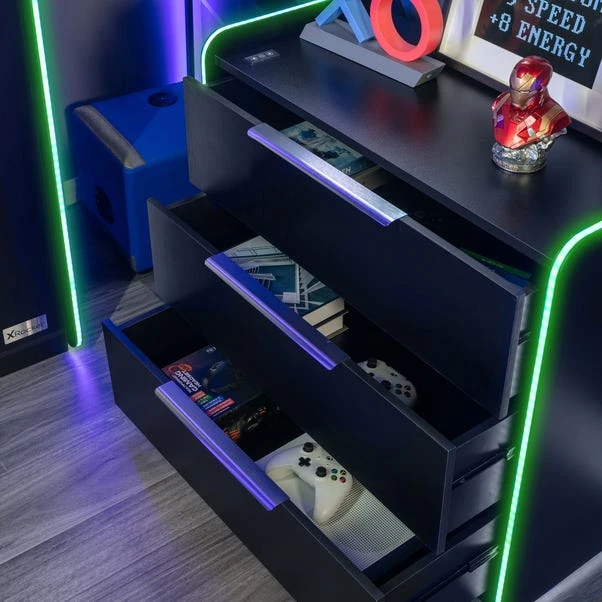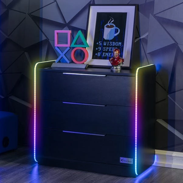 This chest of drawers not only keeps your clothes organised across its three spacious compartments but also provides an open shelf for proudly displaying your gaming trophies. The eSports-inspired design, durability, and safety mounting included make the Electra Chest of 3 Drawers a functional and stylish addition to any gaming room. The Neo Motionâ„¢ Sync LED technology infuses your gaming space with a vibrant glow, offering over 200 lighting options to suit your personal style.