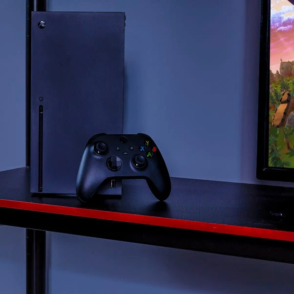 This high sleeper bunk bed features a full-width desk beneath, providing ample space to accommodate a large-scale TV, a console, and accessories, ensuring a comprehensive gaming setup. The single high sleeper bed frame offers an elevated and comfortable sleeping platform, promising a restful night’s sleep after intense gaming tournaments (mattress not included).Ideal for kids and teens, it serves as a space-saving solution for smaller bedrooms, offering both functionality and style. Unleash your creativity with the spacious under-bed capacity, allowing you to build your own gaming den. The full-width built-in desk is perfectly sized to house TVs or PC monitors up to 40″, forming an integrated gaming platform for the perfect gaming setup. Immerse yourself in the world of gaming with the HQ High Sleeper Gaming Bed, where comfort, functionality, and style converge to provide the ultimate gaming haven.